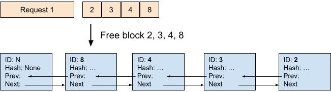 - Allocate new blocks by popping the heads of the free queue. If the head block is a cached block, this also “evicts” the block so that no other requests can reuse it anymore from now on.